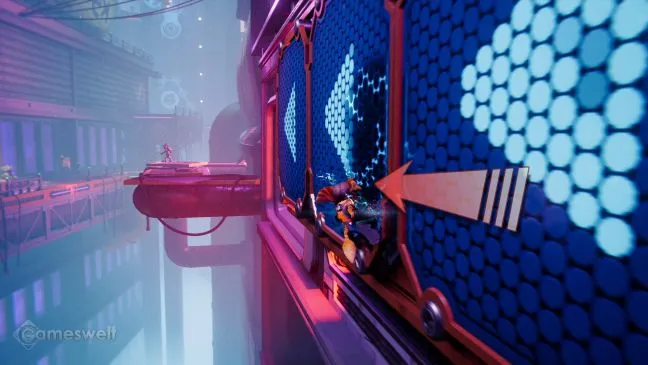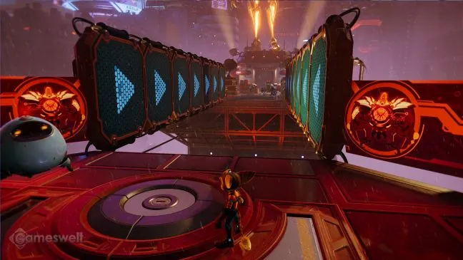 Третий навык фантомного спринта - скольжение по панелям стены, отмеченным стрелками. Это называется "бег по стене". Все, что вам нужно сделать, - это запрыгнуть на плиты, отмеченные стрелками, и продолжать бежать. Перчатка Рэтчета удержит вас приклеенным к плитам - по крайней мере, пока вы двигаетесь.