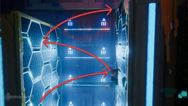Прежде чем подойти к светящейся стене, которая приведет вас дальше. Вам следует посмотреть направо. Там находится узкий переулок. Забегите в него. Вы найдете желтый мерный портал (местоположение 2 на нашей карте). Если вы воспользуетесь им (нажмите L1), он приведет вас к ящику, где вы сможете воспользоваться еще одним желтым порталом, чтобы добраться до спрятанного золотого болта. Это редкий предмет коллекционирования в игре. Используйте двухмерные порталы, чтобы вернуться в переулок. Бегите к тому месту, где вас перехватил патруль. Там вы найдете две стены, расположенные близко друг к другу, с шестиугольными плитками, которые светятся синим цветом.