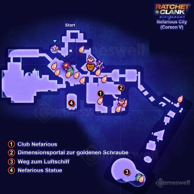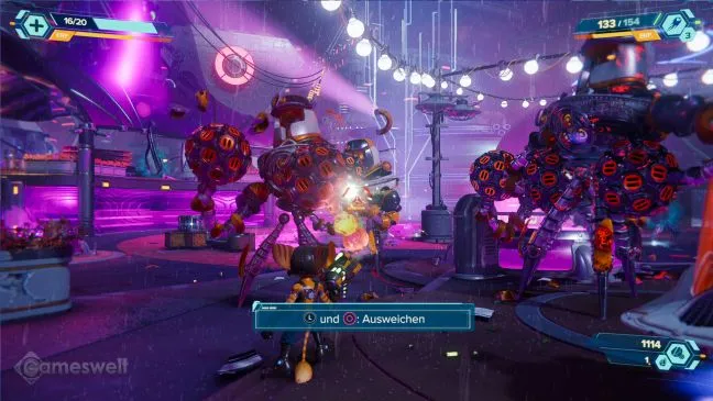 В следующей сцене Габаритомер выходит из строя и пробивает дыры в реальности по всей Вселенной. Кланка отбрасывает от его друга, и его находит другая женщина-ломбакс. Ее зовут Клепа. Тем временем доктор Нефариус счастлив, что попал в измерение, где он властвует над всем. Он - император. По крайней мере, так они думают, потому что его коллеги из этого измерения сейчас нет. Возвращаемся к игре: Рэтчет просыпается в незнакомом городе. Он мрачен и негостеприимен. Ваша первая задача вместе с ним - найти Кланка. Бегите по переулкам - пока есть только один путь. Она ведет через крыши домов к большой подъемной платформе. На самом верху нужно повернуть рукоятку засова, чтобы открыть находящуюся за ним дверь. Для этого нажмите квадратную кнопку, чтобы Рэтчет прикрепил свой гаечный ключ к кривошипу, а затем нажмите правую кнопку на аналоговом стике, чтобы повернуть кривошип. За дверью находится огромный, залитый неоновым светом научно-фантастический город в стиле Бегущий по лезвию.