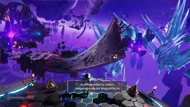 Отсюда можно выйти на открытое пространство. Благодаря магнитным поверхностям (их можно узнать по шестиугольным плиткам) ваши ботинки будут прилипать к дорожкам. Вы можете даже переместиться на другую часть пути, переместив шестиугольное белое перекрестие на часть магнитной дорожки и нажав кнопку "Круг".