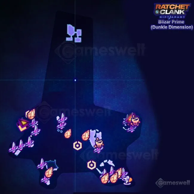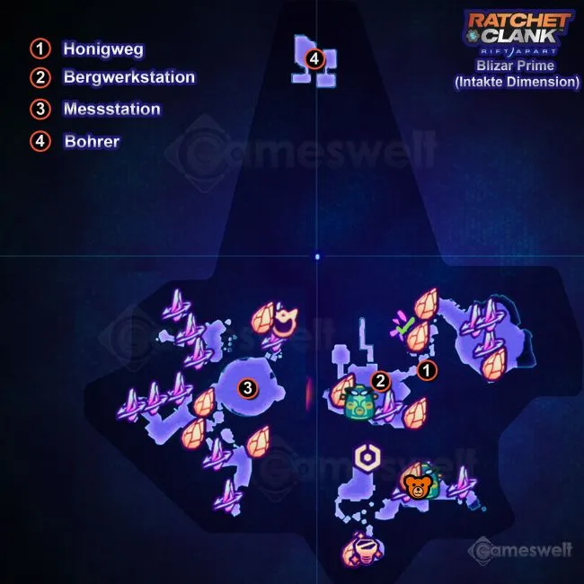 Ривет и Кланк хотят как можно быстрее найти главного инженера штаб-квартиры горнодобывающей компании. Но не стоит так торопиться. В правом нижнем углу штаб-квартиры находится кристалл Близона, а чуть выше, на ящиках, на которые можно забраться с обратной стороны. Если вы перейдете здесь в темное измерение, то сможете собрать немного раритана и второй золотой болт, который вращается на платформе далеко над вами. Золотой болт можно получить, если пробежать по этому острову в темном измерении до конца на север, а затем пройти по полуразрушенной магнитной дорожке. Промежутки между частями магнитной дорожки очень большие, поэтому, чтобы попасть на следующий участок, нужно целиться вдаль или смотреть вверх. Затем перейдите обратно в неповрежденное измерение у кристалла.