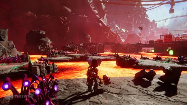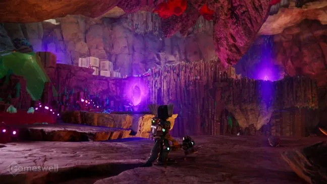 Следуйте по пути, уничтожая по пути атакующих роботов, и переходите с одной разрушенной магнитной дорожки на другую, пока не достигнете очередного кристалла Близон. Перейдите в неповрежденное измерение. Когда вы повернетесь, то сразу же обнаружите медведя Крейгера на красном обрывке, лежащем на земле. Воспользуйтесь терминалом с зеленым экраном, чтобы активировать блокировку выходной двери, а затем выйдите наружу. Пройдите вперед к лаве. Там на вас нападут маленькие существа, с которыми можно легко расправиться в ближнем бою. Здесь путь раздваивается. Слева находится золотой болт и немного раритана, прямо - ваша цель.