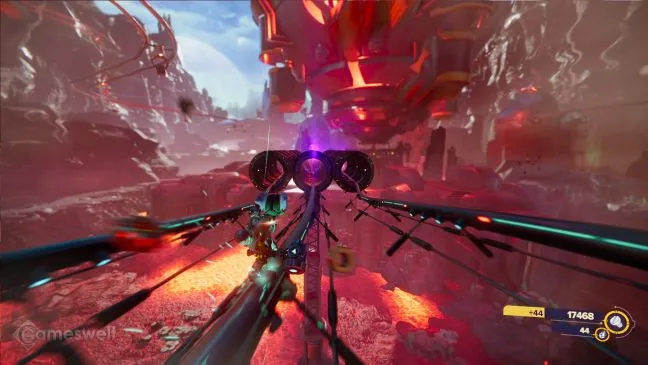 Поверните кривошип молота перед собой, чтобы запустить лифт. Поднимитесь на лифте (он находится на нижнем уровне слева от Вас) и поднимитесь наверх. Помимо нескольких врагов-роботов, здесь вас ожидает набор рельсов, по которым нужно карабкаться. Избегайте препятствий с помощью прыжков и при необходимости меняйте рельсы.