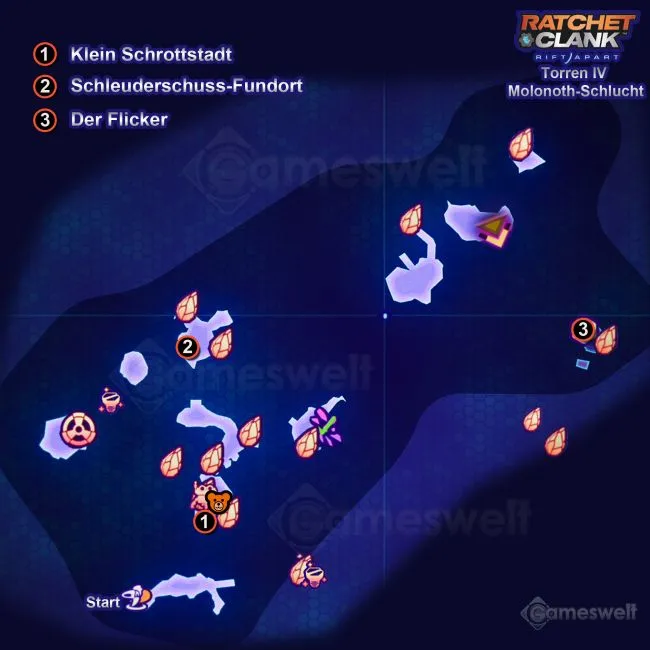 Ривет и Кланк ищут "Мерцающего" на планете Торрен IV. В этом месте, судя по всему, находится поселение, состоящее из частей металлолома. Соответственно, оно называется "Маленький город хлама". Не стоит воротить нос, ведь здесь есть немало ценных вещей. Вскоре после приземления космического корабля вы сможете забрать первый золотой болт.