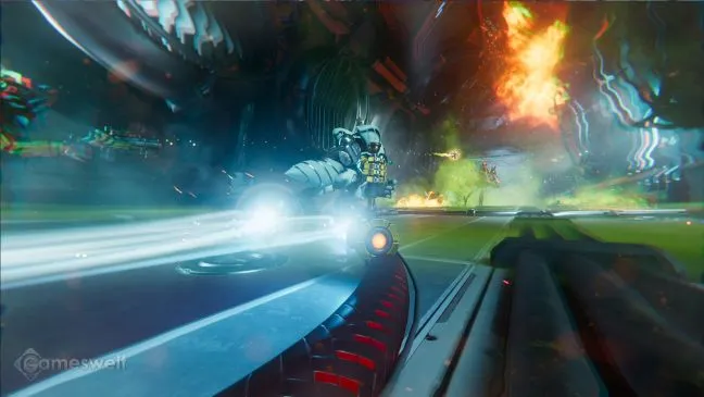 Обогните следующую реакторную ячейку справа и выйдите наружу. Длинный прыжок с помощью стрел ускорения и проход из рогатки на желтом крюке приведут вас на эвакуационную платформу, где вы снова столкнетесь с несколькими роботами.