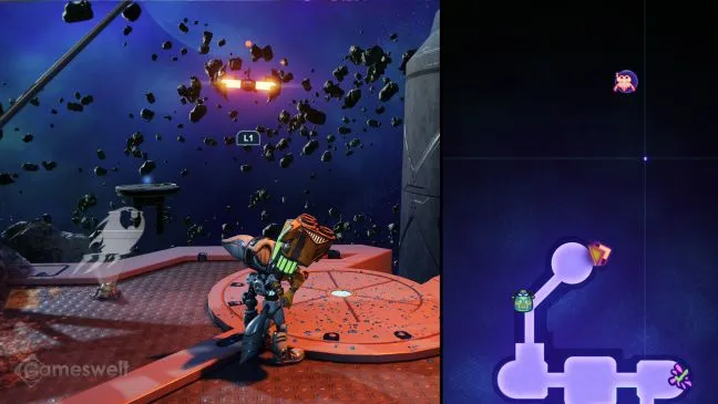 Пробегите по полю с мусором до входа в бар. Пробегите мимо входа в бар справа и встаньте на край платформы. Там вы найдете желтый крюк. Перебросьте его на крошечный островок вдалеке и возьмите шпионский бот.