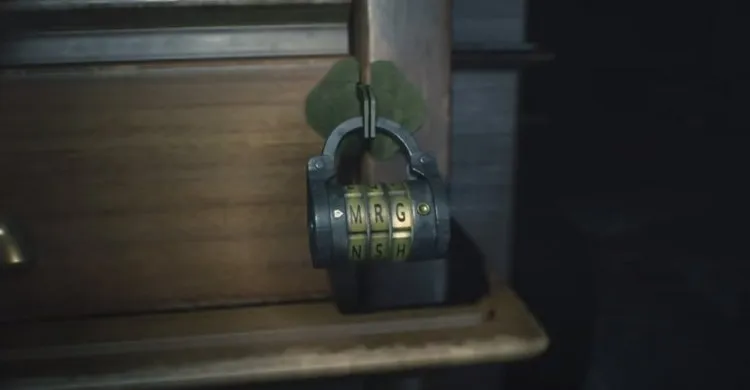 Взламываем замок на столе Леона, используя символы NED с левой стороны и MRG с правой. Забираем обойму для увеличения и применяем на пистолете.