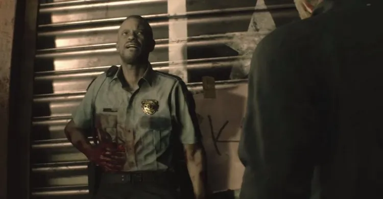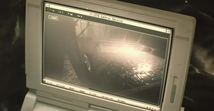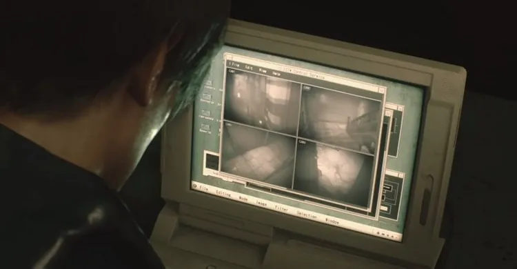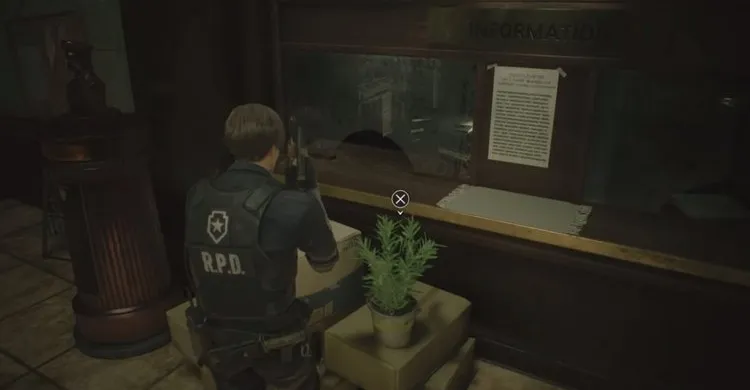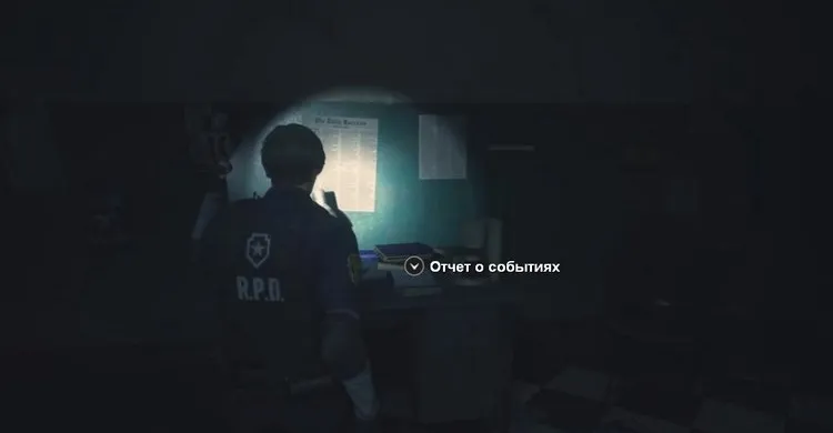 В холле с правой части с ящиков забираем спрей, полностью восстанавливающий шкалу жизни. Забираем со стола патроны, машинку и сундучок. Изучаем компьютер неподалеку. На камерах видеонаблюдения видим борьбу полицейского с зараженными.