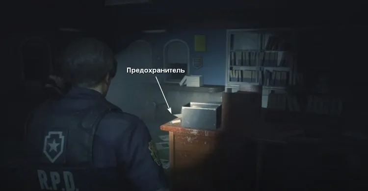 Направляемся к дверям в восточной части, открываем их нажатием рычага. Используем фонарик: слева видим щиток без предохранителя.