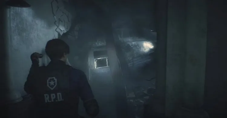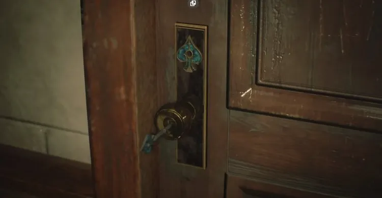 Направляемся к концу лестницы. В коридоре забираем патроны, идем в направлении отверстия в стене. Там есть шкафчик, на котором нужно использовать код RES (DCM), берем пять револьверных патронов, со стола забираем пиковый ключ.