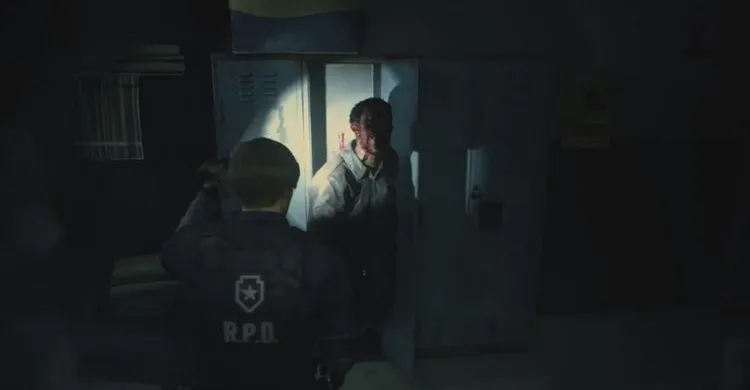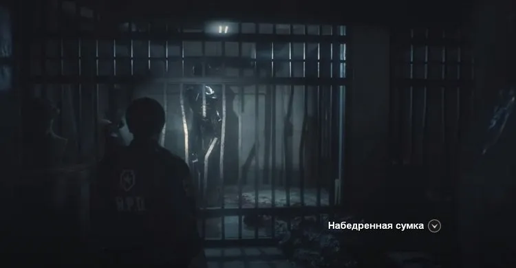 Направляемся к двери в правой части, видим белый значок на замках. Замки откроются сами по себе, при приближении. В следующем помещении можно включить свет, снимаем патроны с трупа полисмена.
