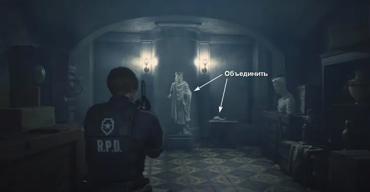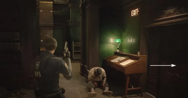 Входим в помещение. Марвин звонит нам по рации и приказывает направляться назад в холл. Идем по мосту. Пол под главным героем ломается, он падает вниз. Видим несколько зараженных, стреляем в них. Под шкафом находим домкрат. Передвигаем несколько стеллажей, забираем патроны. Возле тела полисмена забираем еще один нож (прочный, можно менять нож при поломке). Возле двери на столе находится красная книга, которая дальше нам понадобится.