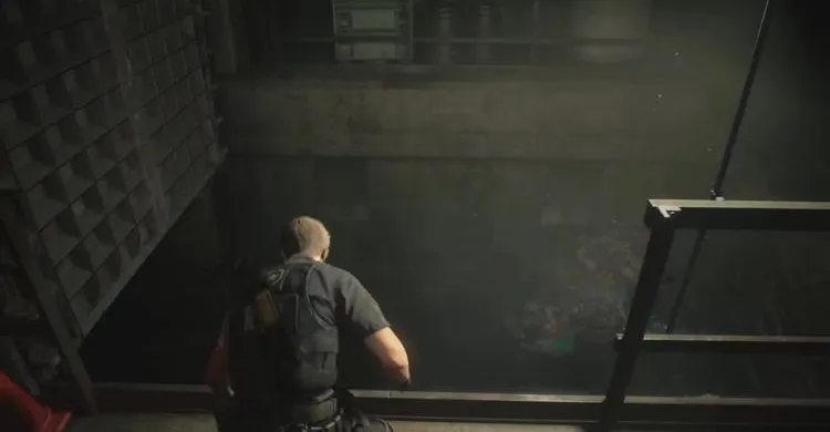 Леон приходит в себя, играем за него. Придётся идти по коридору, поскольку лестница, которая вела в трубу, разрушена. В лифте наверх. От комнаты спускаемся и прыгаем в воду.