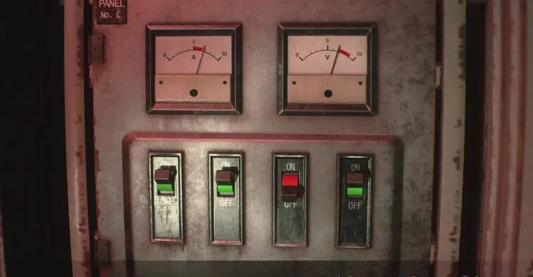 Снизу берём синюю и зелёную траву. Используем рычаг, он окажется сломанным. С левой стороны заходим в комнату и подбираем красную траву. В электрощитке переключаем выключатели: вкл, вкл, выкл, вкл.