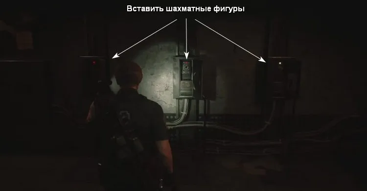 С левой стороны заходим в лифт, проходим через круглую комнату и помещение с бассейном. По образу шахматных фигур воспользуемся всеми имеющимися затычками в панели. Те, что изначально стоят неверно, нужно переставить. Некоторые панели без подсказок, так что находим стенд в центре: