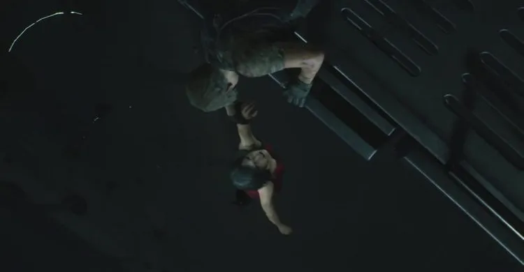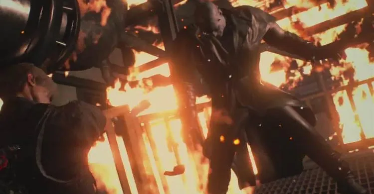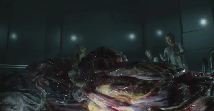 Следующим этапом будет зал, где обращаем внимание на машинку и сундук. Пользуемся лифтом. Далее расправляемся с зомби, подбираем траву и бежим к лестнице, где произойдет встреча с Тираном. Монстра нужно будет обойти по круговой дорожке и бежим дальше. Тиран все равно вас догонит после взрыва. От этого взрыва как раз упадем на нижнюю площадку.