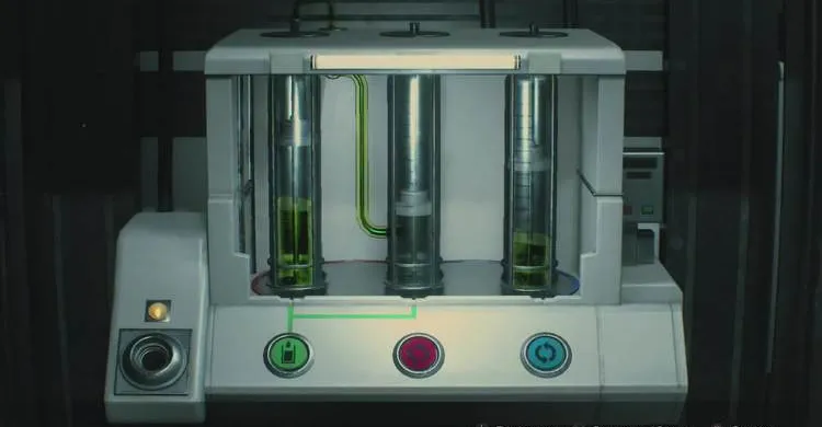 Зайдя в эту комнату, нужно будет применить картридж. Теперь перед игроком будет стоять непростая задача. Необходимо решить логическую головоломку, целью которой является уравновешивание жидкости в трех сосудах.