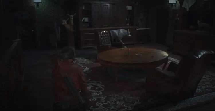 Когда двери лифта откроются, бегите в левый угол на балкон за зеленой травой, а затем в кабинет шефа. На стенах будут различные чучела животных, а также сундук. Прочитайте на главном и круглом столике все бумаги и возьмите патроны для автомата.