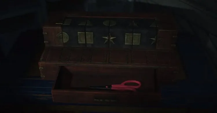 Когда это произойдёт должен открыться ящик, в котором лежат ножницы. С их помощью можно разрезать коробку, что расположена справа. Так откроется люк, через который можно выбраться из комнаты и попасть в соседнюю.