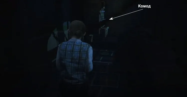 В конце коридора стоит комод. Нужно выдвинуть его средний ящик, чтобы воспользоваться как лестницей и достать до окна, чтобы вылезти через него. Оно ведёт в большую комнату. Сразу справа дверь. Лестница ведёт вниз к запертой двери.