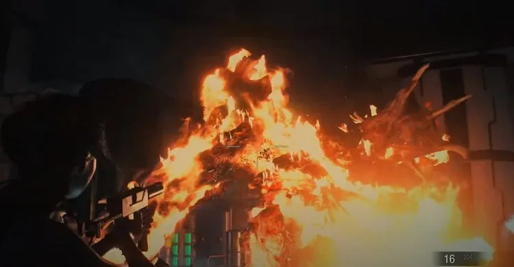 Начнётся десятиминутный отсчет времени. Бежим по мостику, аккуратней по дороге будут зомби, спускаемся вниз по лестнице. Мы задерживаем зомби, стреляя в них, пока Шерри лезет вверх по трубам, она откроет дверь. Мы попадаем в горящую комнату, здесь будет один зомби.