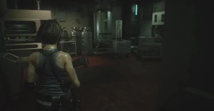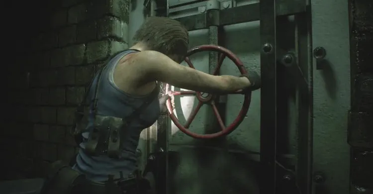 Поворачиваем красный вентиль на двери, и прячемся в комнате слева. Внутри найдем печатную машинку и сундук для предметов. На письменном столе стоит красная трава. Открываем серые шкафы, чтобы достать патроны для пистолета и дробовика. Забираем Карту канализации, висящую на правой стене.