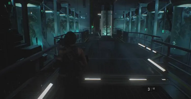 Переходим в коридор с капсулами. Подходим к первой колонне, возле неё стоит чемодан, в нём забираем взрывчатку Б. Переходим в лифт, поднимаемся, находим патроны. Убиваем парочку зомби. Стена вдалеке, возле неё взрывчатка Б. Находим текст Выражение озабоченности. Видим чемодан, в нём взрывчатка А. Замечаем зелёную полку, её можно открыть, забираем Пробирку с жидкостью.
