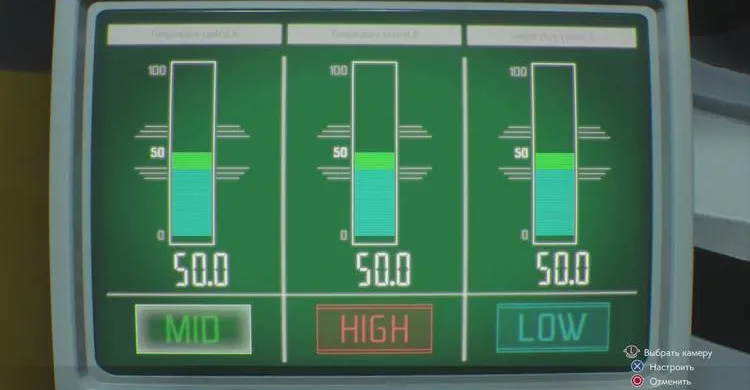 Обратно к синтезатору вакцины. Головоломка: перед нами три столба с указанным уровнем воды. Задача, наполнить их таким образом, чтобы уровень в каждом их столбов находился в центральной части зелёного сектора. Решение: Mid, High, Low.