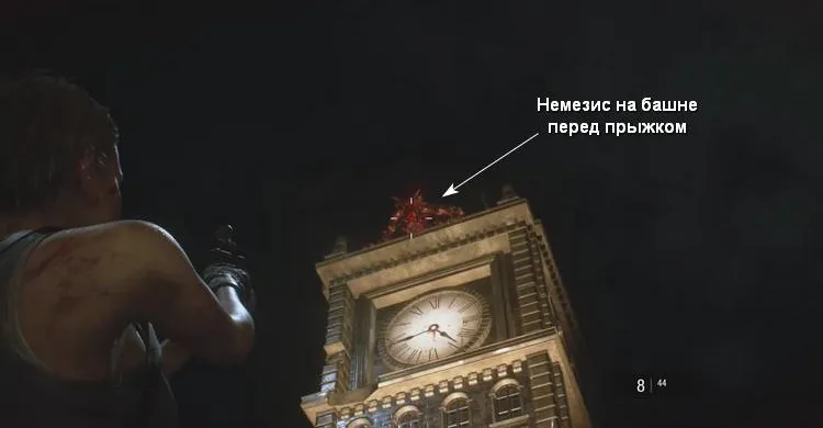 Второй бой пройдет на площади возле высокой Башни с часами, куда прибежит Джилл, спасаясь бегством от мутировавшего в четвероногое существо Немезиса.