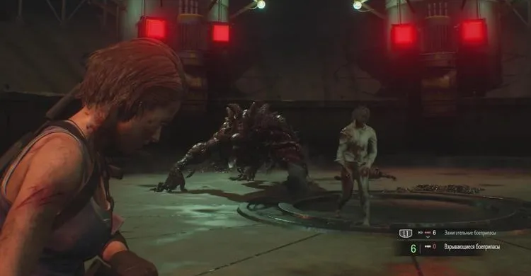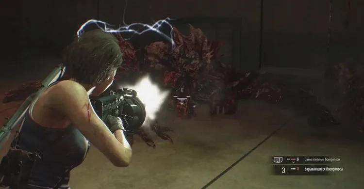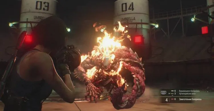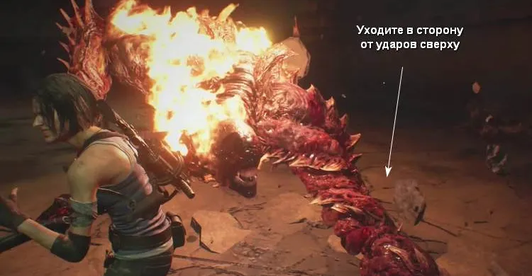Тактика ведения боя на первом этапа несложная. Держим Джилл на средней дистанции, используя гранатомет. Он затрудняет передвижение босса. Пользуясь этим моментом, меняем гранатомет на дробовик и расстреливаем оглушенного монстра.
