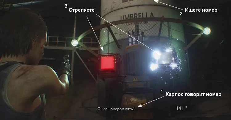 Следите за тем, что кричит Карлос, если вы вовремя не отреагирует на цель и не поразите две красные лампы, итог может стать печальным для вас, его прыжок с цистерны возможно станет последним что увидит Джилл.