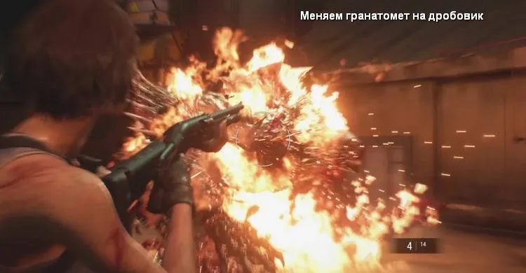 Когда Немезис придет в себя он совершит прыжок в вашу сторону. Снова достаем гранатомет, выстреливаем, отбегаем, меняем на дробовик и так действуем до начала второго этапа.
