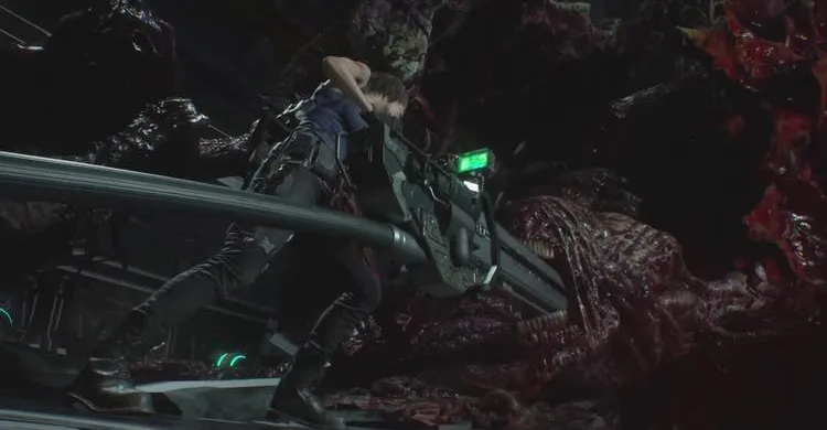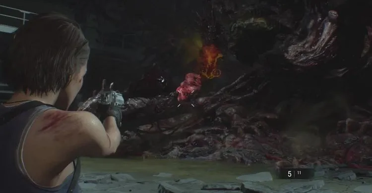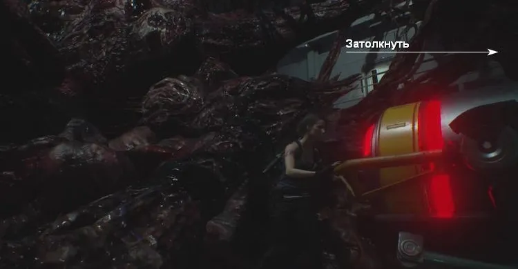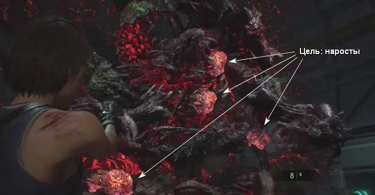 Но выстрела хватит только на один раз, необходимо чтобы пушка перезарядилась. Для этого вам придется самостоятельно подтолкнуть красные светящиеся банки, торчащие из стены. Перед этим, достаньте пистолет и стреляйте в розовые наросты на боссе, иначе Немезис нанесет вам сокрушительный урон.