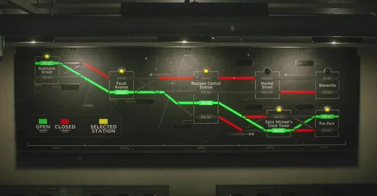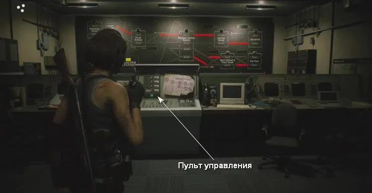 Вам необходимо вернутся в железнодорожное здание «Kite Bros». В помещении, рядом с комнатой охраны (где оружейный сейф с Дробовиком М3), находится комната управления станцией метро. В ней на стене интерактивное табло с схемой ветки. Линии на схеме горят красным цветом, так как они обесточены.