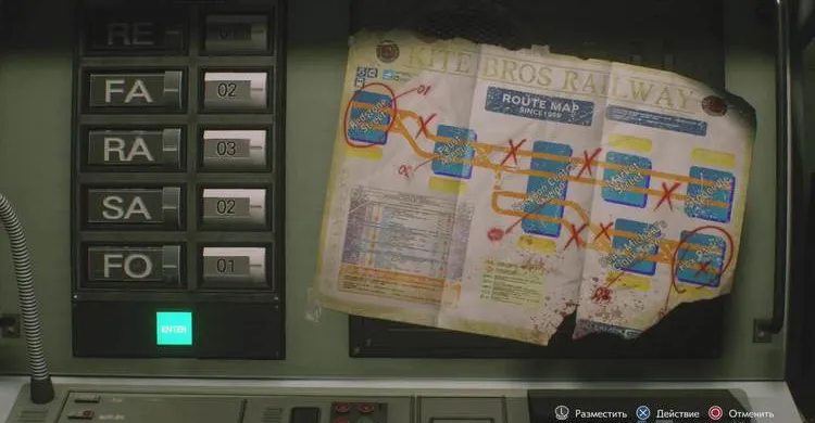 На пульте есть карта бумажном варианте с подсказками. Вы должны пользуясь ручками установить правильно маршрут по улицам, через который будет пущен ток: RE (01), FA (02), RA (03), SA (02), FO (01). При правильной комбинации активизируется зеленая кнопка Enter. Подтвердите, нажав на нее.