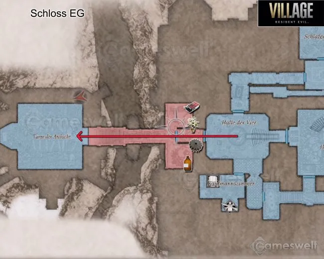 Теперь поспешите в Зал Четырех и установите маску на место. Когда все четыре маски на месте, дверь в Зал Четырех наконец-то можно открыть. Однако леди Димитреску это совсем не нравится. Пока механизм двери медленно запускается, она преследует вас и пытается ударить Итана. Продолжайте двигаться, пока процесс не завершится и Итан не сможет проскочить в дверь.