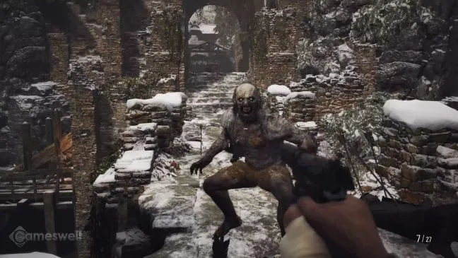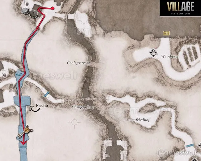 После нервной схватки с леди Димитреску на некоторое время все станет спокойнее. Перед тем как отправиться на скалу, обыщите хижину, расположенную перед вами, а также туалет за ней. Дверь в горный туннель заперта. Откройте ее, сняв навесной замок выстрелом из пистолета. Это не последний раз, когда вы открываете дверь таким способом. Теперь бегите по туннелю к небольшому горному пруду.