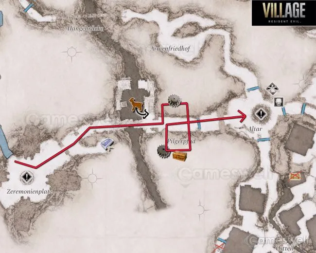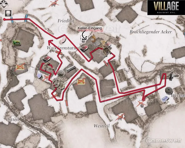 В деревне теперь есть несколько возможностей разграбить больше снаряжения. Например, в одном из домов с запертыми ящиками. Вы вольны поступать так, как вам нравится, хотя доступ к некоторым домам по-прежнему невозможен. Однако главной проблемой для вас является доступ к дому с красным дымоходом, который находится прямо под статуей Валькирии на карте. Главные ворота заблокированы и заперты изнутри. Поэтому придется пробираться другим путем. В этом вам поможет наша карта.