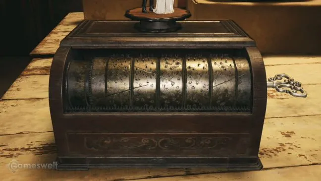 Достаньте из инвентаря заводной ключ, который Вы получили от деревянного манекена. С его помощью можно открыть музыкальную шкатулку, но она не будет играть. Барабаны музыкальной шкатулки находятся в неправильном положении, и ничего не работает. Необходимо вернуть барабаны в правильное положение.