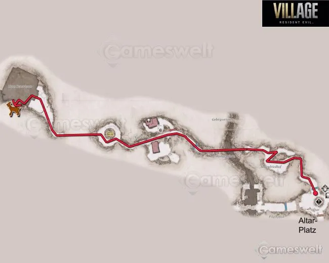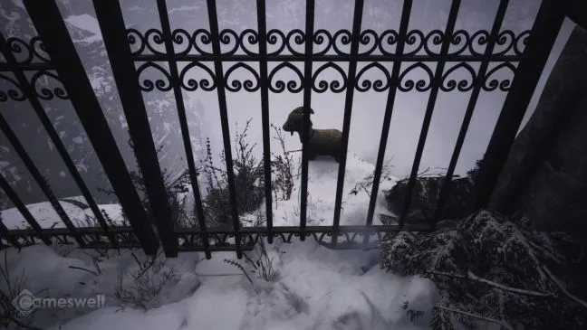 Бегите к большим воротам, где у Итана начинаются галлюцинации. Он видит Мию на заснеженной тропинке. Следуйте за ней. В данный момент вы ничего не можете сделать, кроме как оставаться на тропинке, так как все пути к зданиям слева и справа заблокированы. Попасть туда можно только на обратном пути.