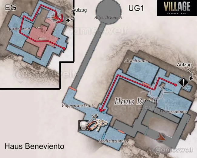 Идите по коридору, пока не попадете в странную, потрепанную комнату за двойной дверью, где на стуле сидит кукла. Как только Вы пытаетесь взять куклу в руки, свет гаснет, и голос шепчет Вам жуткие вещи. Свет снова включается, а кукла исчезает. Однако все оружие и снаряжение тоже исчезло. Итан оказывается беззащитным.
