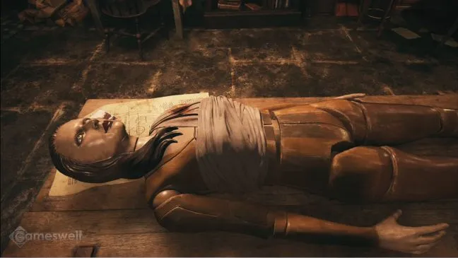 Осмотрите манекен. Пусть Итан прощупает ее правую верхнюю руку, пока не найдет внутри серебряный ключ. Также снимите правое предплечье, чтобы Итан мог заглянуть в сустав. В нем вы увидите символ с тремя закрытыми глазами. Запомните это! Теперь переключитесь на другую сторону и возьмите окровавленное кольцо с левой руки манекена. Наконец, разберите левую ногу. Так Вы найдете заводной ключ.