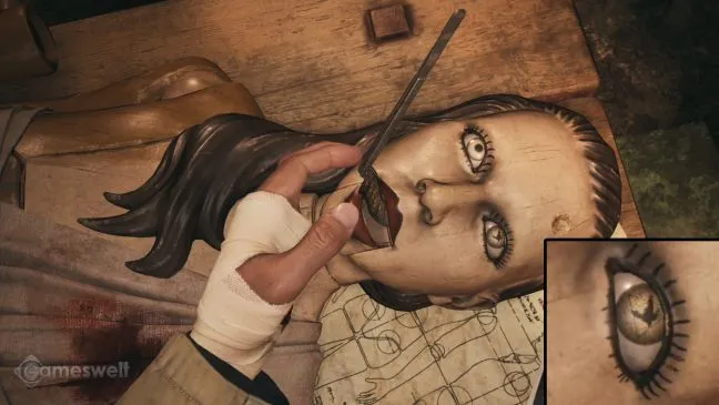 Осторожно, возможна ошибка! Во время игры в версию для PS5 мы столкнулись с ошибкой, которая не позволяла выполнить сразу два действия. Из-за ошибки мы не могли выбрать ни глаз, ни рот деревянного манекена. Таким образом, мы не могли ни раскрыть символ птицы, ни найти кинопленку во рту. Сначала нам пришлось загрузить игру с более ранним счетом, и даже тогда она работала только в том случае, если мы находились на расстоянии чуть более метра от куклы, чтобы на экране отображался символ взаимодействия.
