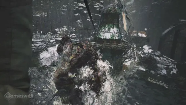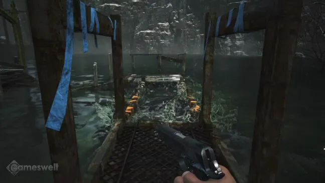 Забегите внутрь первой ветряной мельницы и спуститесь по лестнице. Выйдите через дверь и перейдите на крышу полузатонувшего дома. Плавающий металлолом служит мостиком на следующую крышу. Чтобы продолжить путь оттуда, нужно выстрелить в кусок дерева, помеченный желтой лентой. В результате образуется еще один пешеходный мост на воде.