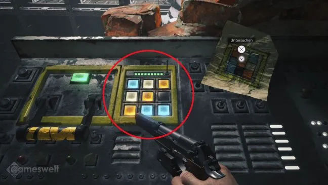 Теперь оборудование работает. На столе есть даже рисунок, показывающий, как нужно настраивать работу шлюза. Нужно нажимать на квадратные кнопки до тех пор, пока они не покажут нужный цвет, что создает цветовой рисунок. Вы очень стараетесь, но все равно ничего не происходит? Причина проста: Итан держит бумагу вверх ногами! Чтобы найти решение, нужно посмотреть на черный квадрат и повернуть его на 90 градусов против часовой стрелки. Посмотрите на наш рисунок, чтобы найти правильное решение.