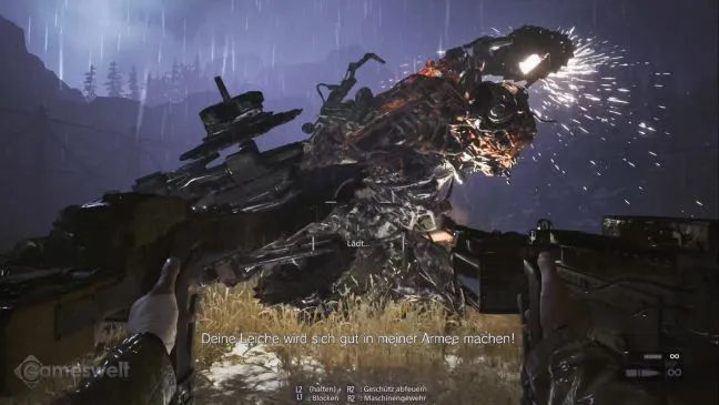 Гейзенберг сидит в гигантской боевой машине. Сразу же устройте ему ад, например, с помощью большой пушки. Это удерживает его на расстоянии и немного ослабляет его. Кроме того, это создает нагрузку на его машину, на которой теперь видны красные светящиеся соединения. Стреляйте в эти красные пятна из пулемета.