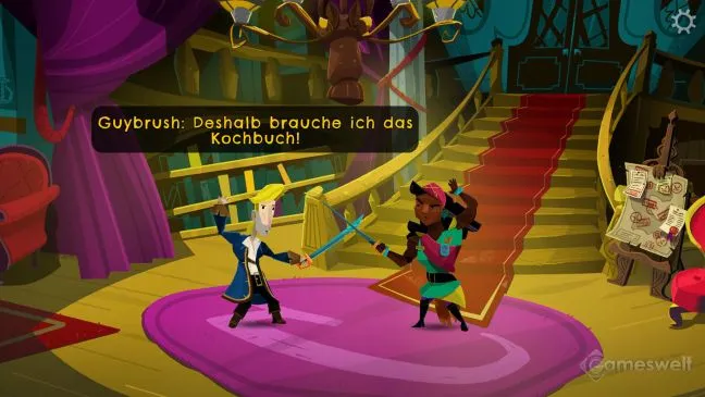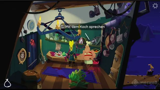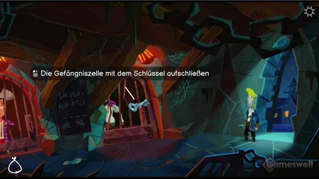 Как и в Monkey Island 2, на столе Уолли лежит монокль. Когда он пытается украсть монокль, оказывается, что секретность вовсе не нужна. Уолли выдает его. Поэтому возьмите монокль и выйдите из карточного магазина. Тут же развернитесь и снова войдите в его магазин. Возьмите с собой второй монокль. Теперь откройте свой инвентарь и объедините оба монокля, чтобы они еще лучше увеличивались. Теперь у вас есть все, что нужно из карточного магазина, и вы можете снова выйти на улицу.