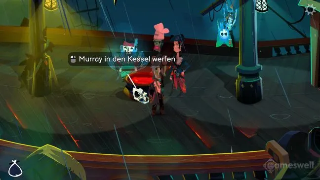 Вернитесь по лестнице на верхнюю палубу к остальным членам команды, стоящим вокруг котла. Бросьте сплющенного Муррея в кипящее зелье.