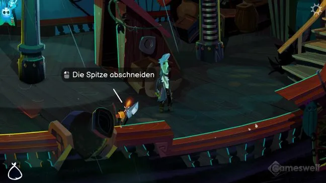 Как только ЛеЧак покинет палубу, снова встаньте к колоколу и позвоните в него один раз, чтобы начать голосование. Все члены экипажа голосуют за плавание. Теперь остается только положить сплющенный череп Муррея в пушку на верхней палубе и выстрелить из нее светящейся палкой, стоящей рядом с пушкой, чтобы ваши соперники смогли допить зелье. Путешествие на остров начинается. Однако незадолго до прибытия Гайбраш случайно снимает с себя маскировку и вынужден сразиться с ЛеЧаком на мечах.