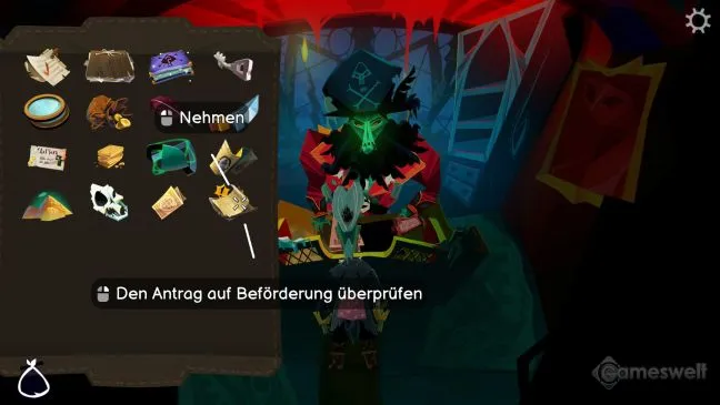 Теперь, когда Фламбе занят едой, он больше не читает книгу шуток. Возьмите ее у него и спуститесь с ней на верхнюю палубу. Там вы вручите книгу с ног до головы влюбленному в нее Эппл Бобу, который рад новому развлечению и теперь тоже готов проголосовать за поездку на Остров обезьян.